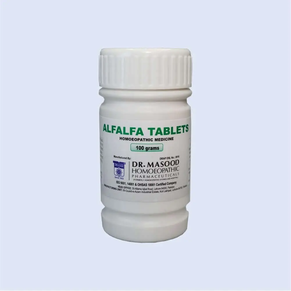 Masood’s alfalfa tablets are a tonic tab for the whole family. Alfalfa tablets help Gain weight & increase appetite. Effective in nervous debility and digestive disorders. Increases the appetite and induces restful sleep. Good for after-effects of anxiety, worry and overwork. Useful in Anaemia and chlorosis. Presentation: 20g, 100g and 500g.