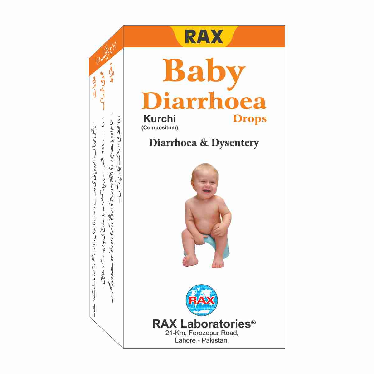 Indications: Diarrhoea. Colic, cramps, indigestion, gas, inflammation of bowels, watery diarrhoea with offensive smell, acute and chronic diarrhoea, sudden stool after eating, nausea and vomiting, irritability, loss of appetite and mild fever. Diarrhoea due to Side-effects of allopathic drugs, weather changes and epidemic diseases. Rax baby diarrhea drops is useful in all types of diarrhea and weakness. Dosage: Adults: 10 drop after every four hours or as prescribed by the Physician.