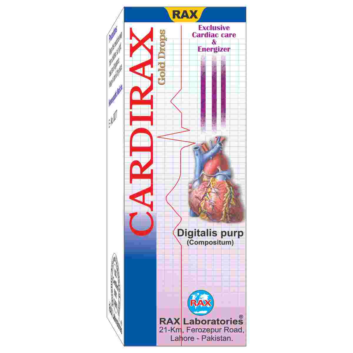Indications: Cardiac ailments, Heart beat irregular, pulse fast. Dyspnoea, angina pain which spreads to left arm, numbness of hands and feet, high blood pressure. Cardirax gold drops is a good tonic for heart and is also a good remedy of heart ailments. Dosage: Adults: 20 drops, Children: 10 drop after every four hours or as prescribed by the Physician.