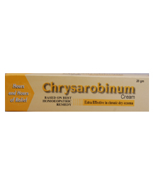 Composition: Chrysarobinum Ø. Indications: Effective cream for skin diseases. useful treatment of eczema, boil carbuncles, ring worms, scabies and seborrheic dermatitis. Provides relief in pimply, dry, rough and scaly skin. Direction of use: Apply Chrysarobinum cream 2-3 times on the affected part. Clean the skin before application of the cream or as prescribed by Homoeopathic Doctor. Presentation: Available in 20gm packing. Precautions: To be used as directed by a registered homoeopath. Avoid contact with eyes. Keep out of reach of children.