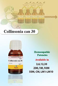 Collinsonia Canadensis Homoeopathic Potency (Dilution) Indications / Symtoms : Pelvic and portal congestion, resulting hæmorrhoids and constipation, especially in females. Depressed arterial tension, general atony of muscular fiber. Chronic nasal, gastric, and pharyngeal catarrh, due to portal obstruction. Dropsy from cardiac disease. Pruritus in pregnancy, with piles. Constipation of children from intestinal atony. Said to be of special value when given before operations, for rectal diseases. Sense of weight and constriction. Venous engorgement. Description : Head.--Dull frontal headache; from suppressed hæmorrhoids. Chronic catarrh. Yellow-coated tongue. Bitter taste (Colocy; Bry). Rectum.--Sensation of sharp sticks in rectum. Sense of constriction. Vascular engorgement of rectum. Dry feces. Most obstinate constipation, with protruding hæmorrhoids. Aching in anus and hypogastrium. Constipation during pregnancy; with membranous dysmenorrhœa, following labor (Nux). Painful bleeding piles. Dysentery, with tenesmus. Alternate constipation and diarrhœa, and great flatulence. Itching of anus (Teucrium; Ratanh). Female.--Dysmenorrhœa; pruritus of vulva; prolapse of womb; swelling and dark redness of genitals; pain on sitting down. Membranous dysmenorrhœa, with constipation. Pruritus. Cold feeling in thighs after menstruation. Sensation of swelling of labia and of clitoris. Respiratory.--Cough from excessive use of voice; "minister's sore throat"; sharp pain in larynx. Hoarseness. Harassing, dry cough. Heart.--Palpitation; rapid but weak. Dropsy. After heart symptoms relieved, piles or menses return. Chest-pains alternate with hæmorrhoids. Oppression, faintness, and dyspnœa (Acon ferox). Modalities.--Worse, from the slightest mental emotion or excitement; cold. Better, heat. Relationship.--Antidote: Nux. Compare: Aescul; Aloes; Hamam; Lycopus; Negundo; Sulph; Nux. Dosage : Dose.--Tincture, to third attenuation. Higher potencies where there is organic heart affection. Group : Homoeopathic Potencies Strength : 3,6,12,30,200,1M,10M,50M,CM,LM1 to LM10 Reference : HOMŒOPATHIC MATERIA MEDICA by William BOERICKE, M.D.