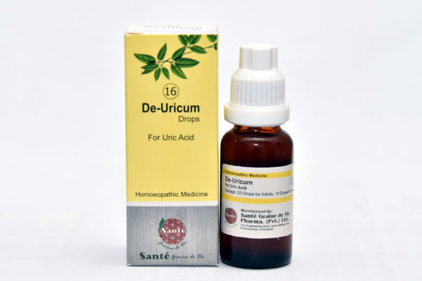 Description SD-16 DE-URICUM (DROP) 20 ml For uric acid Ingredients/Composition: 100 ml contain: Urtica Q Ocimum can Q Colchicum 12x Ruta 30 Eupatorium perf 12x Rhus tox Q Indications Bone erosion, urate crystals , hyperglycemia, swollen and inflamed joints, arthritis. Dosage and administration: If not differently prescribed adults take 20 drops three times a day. Children take 10 drops three times a day. For pediatric doses. Consult your health care practitioner. One bottle containing 20 ml liquid for oral administration, containing the active ingredients in the strengths listed under description. Warnings and Precautions: If symptoms persist, contact a licensed health care practitioner. If you have known sensitivity to any of the ingredients, please consult your licensed health care practitioner before use. If you are pregnant or breastfeeding, seek the advice of a health care professional before use. Keep out of reach of children.
