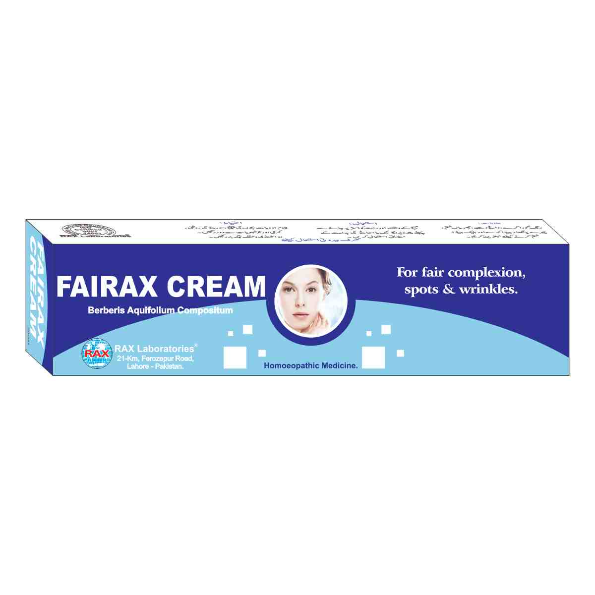 Indications: Skin dry and rough, complexion black, acne, pimples on the face. Rashes, strains, wrinkles, frackles, circles around eyes, moles, face pale. Fairax cream is a useful remedy for face freshness. Dosage: Wash face with soap then apply Fairax cream twice a day.