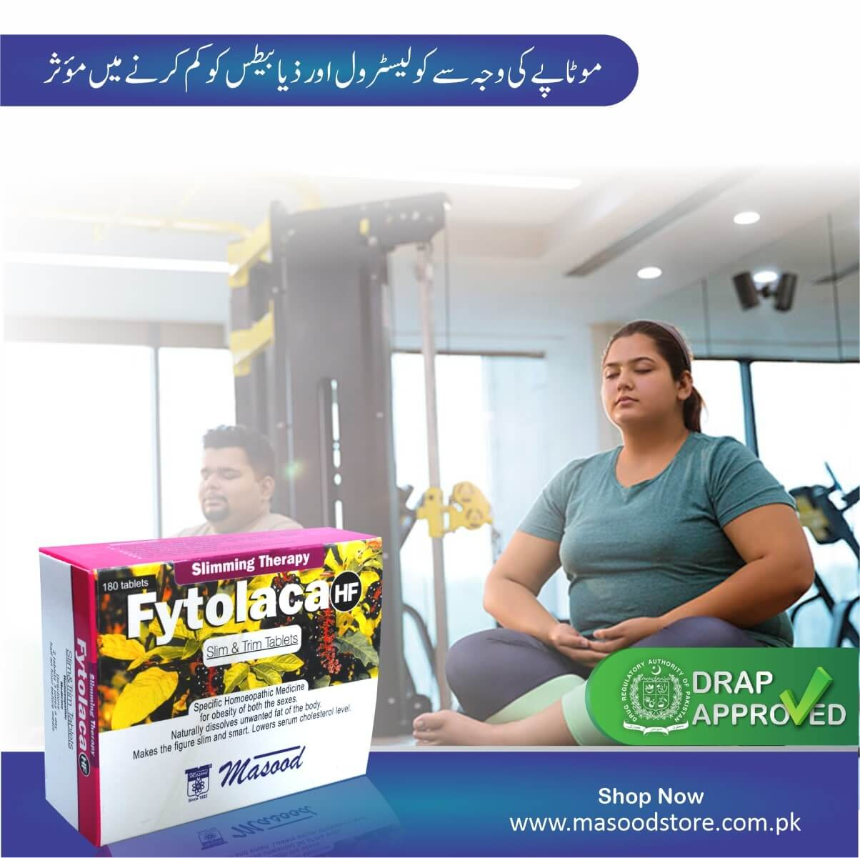 Masood’s Fytolaca Tablets are good for obesity of both the sexes. Indicated in high cholesterol level due to obesity. Effective for arthritis due to obesity or degenerative changes. Obesity due to iodine deficiency. Also used for overweight diabetics patients. Presentation: Sugar free tablets in blister packing (10 x 18).