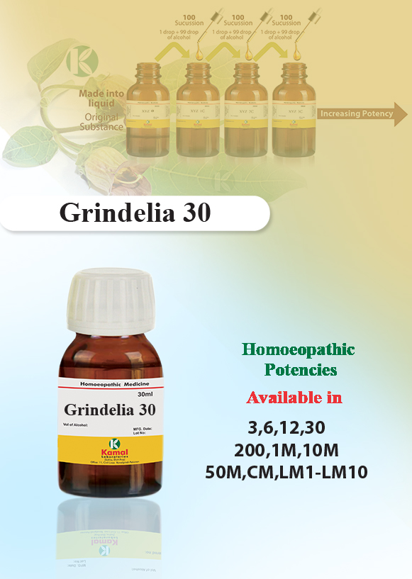 GRINDELIA Rosin-wood - Homeopathy Potency Dilation Indications / Symtoms : Both Grindelia robusta and Grindelia squarrosa have been used for the symptoms here recorded. There is practically no difference in their action, although the G. Squarrosa is credited with more splenic symptoms, dull pains and fullness in left hypochondrium; chronic malaria; gastric pains associated with splenic congestion. Induces paralysis, beginning in extremities Its action is shown on the heart first quickening, then retarding it. Acts on the cardio-pulmonary distribution of the pneumo-g Description : Head.--Feels full, as from quinine. Pain in eyeballs, running back to brain; worse, moving eyes. Pupils dilated. Purulent ophthalmia and iritis. Respiratory.--An efficacious remedy for wheezing and oppression in bronchitic patients. The sibilant rales are disseminated with foamy mucus, very difficult to detach. Acts on the pulmonary circulation. Asthma, with profuse tenacious expectoration, which relieves. Stops breathing when falling asleep; wakes with a star, and gasps for breath. Must sit up to breathe. Cannot breathe when lying down. Pertussis, with profuse mucous secretion (Coccus). Bronchorrhśa, with tough, whitish, mucous expectoration. Sibilant rales. Weak heart and respiration. Cannot breathe lying down. Cheyne-Stokes respiration. Spleen.--Cutting pain in region of spleen, extending to hips. Spleen enlarged (Ceanoth; Carduus). Skin.--Rash, like roseola, with severe burning and itching. Vesicular and papular eruptions. Herpes zoster. Itching and burning. Poison oak (locally as a wash). Ulcers, with swollen, purplish skin. Relationship.--Compare: Tart-emet. Eriodictyon; Lach; Sanguinar. Dosage : Tincture in 1 to 15 drop doses, also lower potencies. Group : Homeopathic Potencies Strength : 3,6, 12, 30, 200, 1000, 10M, 50M, CM, LM Reference : HOMŚOPATHIC MATERIA MEDICA by William BOERICKE, M.D.