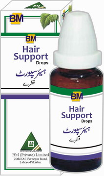 Composition: Acid Phos D5, Arnica Mont D7, Ars Alb D6, Graphites D12, Jaborandi D4, Lycopodium D6, Phosphorus D7, Sulphur D6 General Indication: Hair support drops contains natural homoeopathic ingredients. Its active composition has special effect on the hair, stimulates the hair follicles, controls and prevents dandruff, stops falling of hair, premature grey hair and hair with split ends. These problems may be the result of dietary abnormalities or atomospheric pollution. This BM-remedy may be helpful for better growth, repair of roots and ultimately all the problems of hair are removed. Dosage: Adult 20-25 drops in some water, children half of the same 3-4 times a day, or as prescribed by a Homoeopathic doctor. Availability: 30mL drops standard quality packing