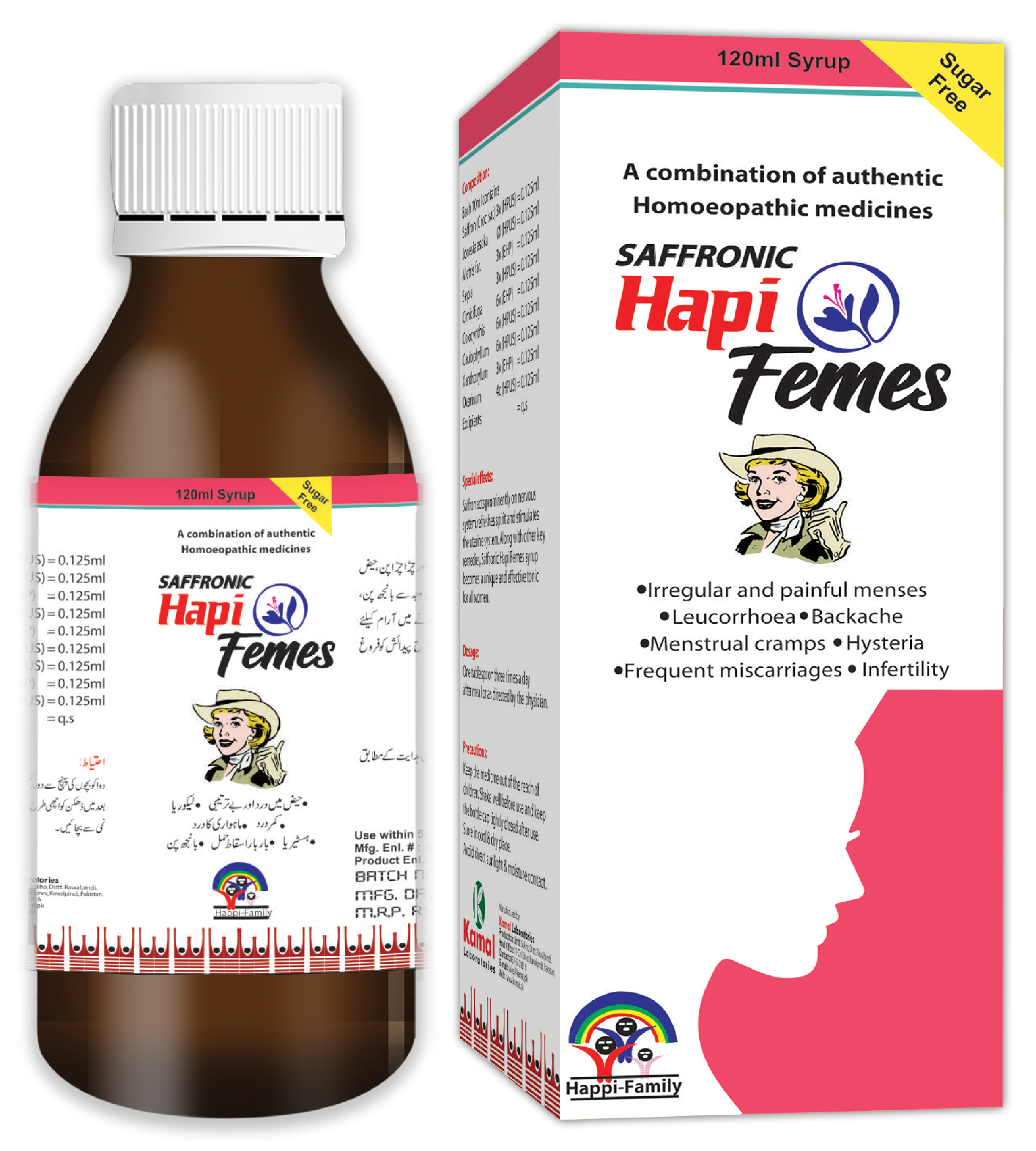 Happi Femes Syrup (Sugar free) Tonic for Women Indications / Symtoms : Useful for the relief of irregular and painful menses, leucorrhoea, backache and irritability during menses, premature & profuse menses with labor- like pain, frequent miscarriage resulting infertility, hysteria (uncontrollable emotions) and dysmenorrhea (menstrual cramps) and general debility with palpitation of heart also helps to strengthen the ovum (egg) and improves fertility. Composition : Saffron (Croc.sat) 3x, Jonesia asoka Q, Aletris far 3x , Sepia 3x , Cimicifuga 6x , Colocynthis 6x , Caulophyllum 6x, Xanthoxylum 3x, Ovarinum 4C , Excipients = q.s Dosage : One tablespoon three times a day after meal or as directed by the physician. Group : Combinaton