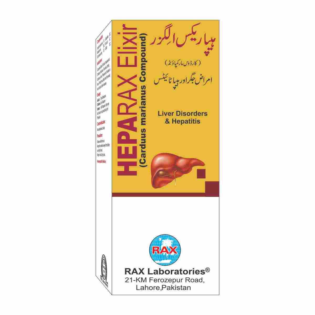 SYRUP Indications: Hypertrophy or atrophy of liver, Jaundice, hepatitis B & C. Yellow colour of eyes and skin, lack of appetite. Bitter taste of mouth nausea and vomiting, pain in right scapula and liver region. Disorder of bile formation, constipation, gas, cramps below ribs and swollen sensation. Heparax drops is a good remedy for liver ailments. Dosage: One tablespoon, Children: One teaspoon after every four hours or as prescribed by the Physician.