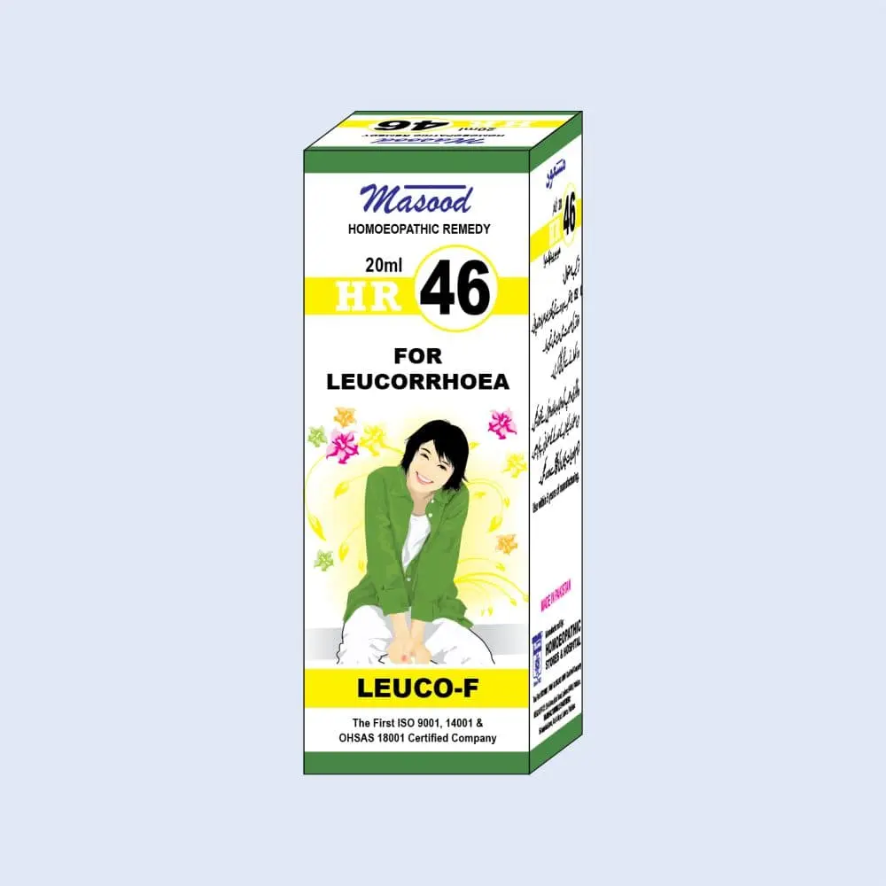 HR 46 is an effective homoeopathic medicine for leucorrhoea and associated symptoms. Indicated in abnormal color vaginal secretions. Used for backache due to leucorrhoea. HR-46 (LEUCO-F) Helpful in vaginal itching and burning. Regulate the menstrual cycle and also improves dysmenorrhea.