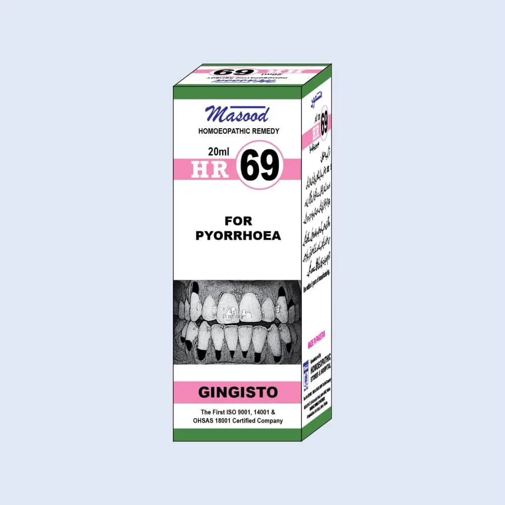 HR 69 is best for pyorrhea or its associated symptoms. Indicated in inflammation, bleeding and ulcers of gums. Effective for sour taste, bad breath or dark coated tongue. Helpful in relieving gums pain while eating. Also used for loosened teeth and recessed gums.