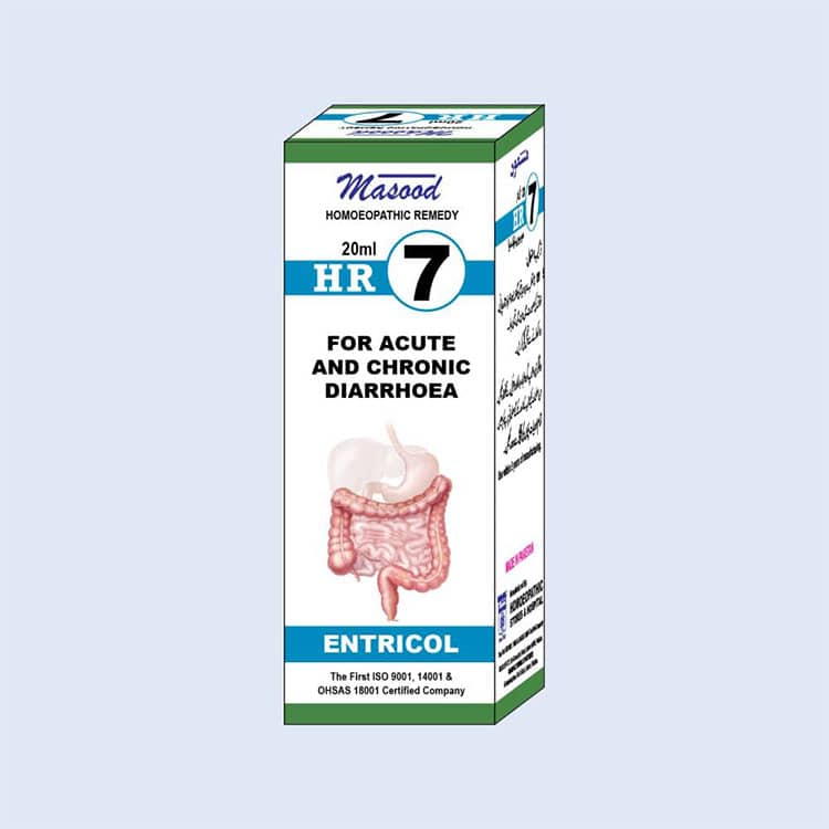 Description Masood’s Hr-7 is a homoeopathic medicine for Diarrhea and other stomach issues. Indicated in watery diarrhoea and its related symptoms. Effective for bloody piles and burning in the anus. Helpful in indigestion and acidity. Good for colic and intestinal spasm. Also used for increasing appetite.
