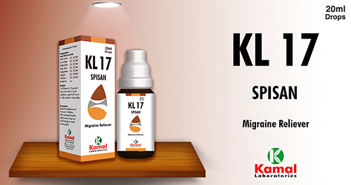 KL 17 (SPISAN) Relief beyond the belief Indications / Symtoms : Periodical migraine , congestion & nervous headache due to insomnia , constipation, Headache with persistent nausea , dizziness & vomiting, Sensitive to light, sound & sometimes smell & touch Composition : Aurum brom D3 Gelsemium D