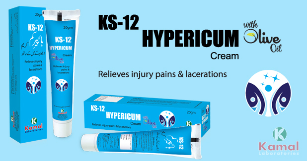 KS 12 HYPERICUM Cream (With Olive Oil) Relieves injury pains & lacerations Indications / Symtoms : An excellent remedy for the relief of severe pain of open and lacerated wounds where the nerves are injured/damaged. Used to relief pain of accidents, punctured wounds, animal bites and injuries. Composition : Active ingredient: Hypericum perforatum � = 2ml Excipients = q.s. Description : Its the flowering plant, perennial and grows in temperate climate. It many parts used for preparing mother tincture. It is very useful for wounds and nerve injuries. Dosage : Directions for use: Apply locally. Rub well and gently to the effected part. Discontinue if skin irritation results. For external use only. Group : Combinations