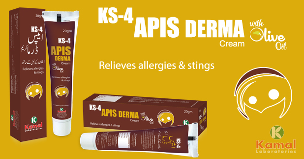 KS 4 APIS DERMA Cream (With Olive Oil) Relieves allergies & stings Indications / Symtoms : Steroid-free, relieves pain in pronounced swelling of bees stings, insect bites, rosy red skin & nettle rush. Effective reliever for eczema, psoriasis and other topical skin disorders. Composition : Active ingredient: Apis mellifica � = 2ml Excipients = q.s. Description : Apis mellifica, the biological name for honey bee, also holds numerous medicinal properties. Dr. Frederick Humphries was the first to establish the medicinal worth of Apis or the common honey bee in the 19th century. The homeopathic medication Apis is prepared using the live body of the honey bee, as only it has a stinger. The stingers of the female honey bee and sometimes even the whole body of the bee, are used to prepare this homeopathic medication Apis mellifica is fast-acting remedy. It is indicated for inflammatory and allergic disorders.it is particularly effective for allergic reactions and symptoms like swelling and redness of the skin. Dosage : Directions for use: Apply locally. Rub well and gently to the effected part. Discontinue if skin irritation results. For external use only. Group : Combinations