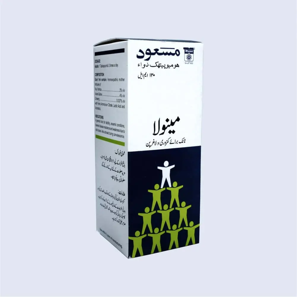 Masood’s Menola tonic is for general weakness and debility. Effective in anaemic conditions and lowered disease resistance. Acts as a tonic for nervous exhaustion. Also advised during convalescence. Presentation: 120 ml.