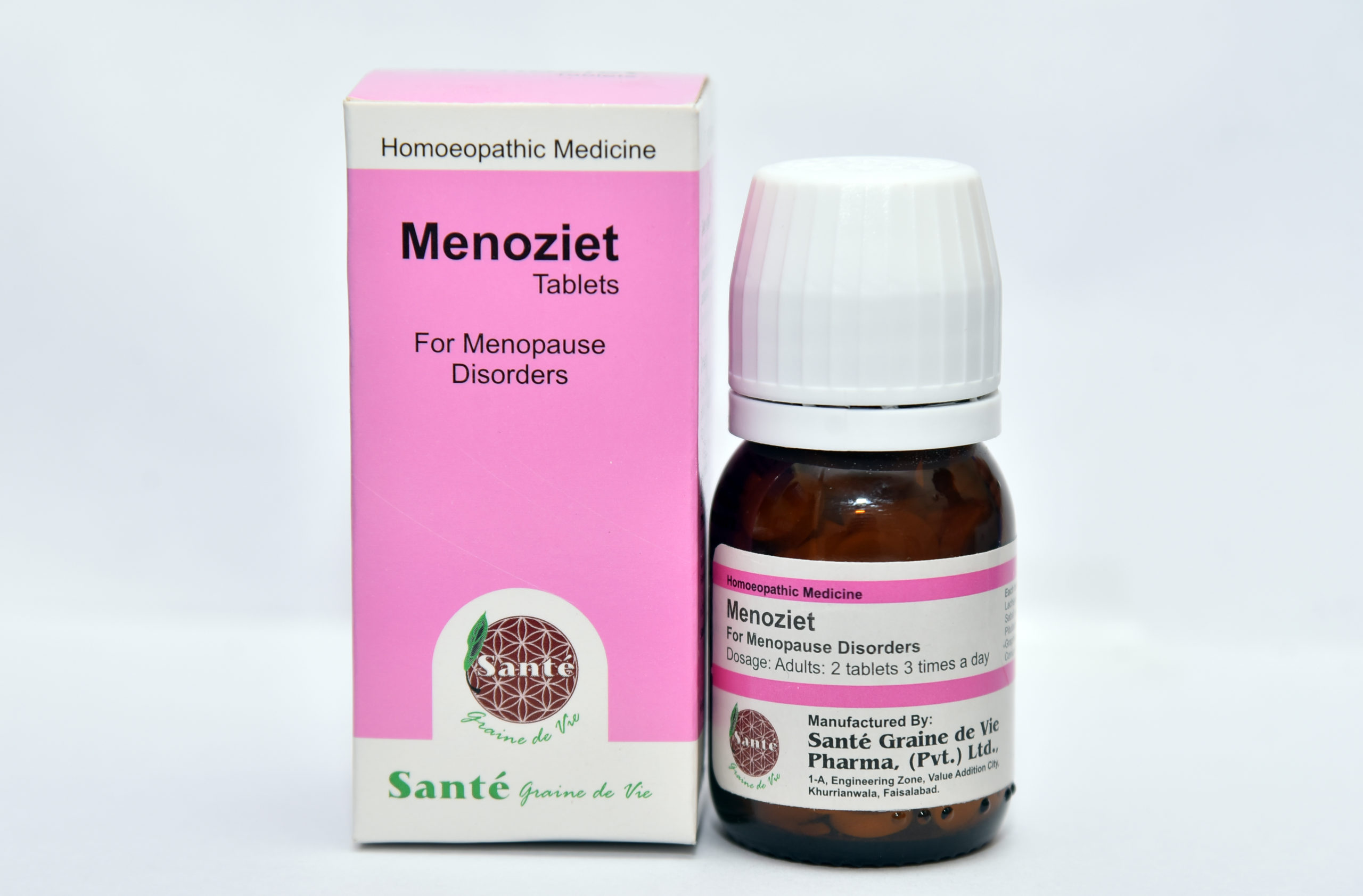 Description ST-18 MENOZIET (Tablets) 100 Tab For Menopause Disorders Ingredients/Composition: 100 Tab contain: Lachesis 30CH Sabal serrulata 3D Pituitarinum 12X Graphites 12DH Conium maculatum 30CH Indications Menopausal problems associated with hot flashes, night sweats, breast tenderness and missed periods, tendency to obesity, emotional instability. Dosage and administration: If not differently prescribed adults take 2 tablets 3 times a day. One bottle containing 100 Tablets for oral administration, containing the active ingredients in the strengths listed under description. Warnings and Precautions: If symptoms persist, contact a licensed health care practitioner. If you have known sensitivity to any of the ingredients, please consult your licensed health care practitioner before use. Keep out of reach of children.