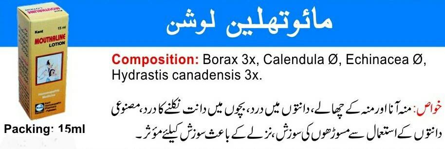 Composition: Borax 3X, Calendula officinalis Ø, Echinacea Ø, Hydrastis canadensis 3X. Indications: Mouth ulcers due to gastric acidity.. Teething pain. Denture irritation. Mouth and lips soreness. Inflammation of gums. Helpful in gums bleeding and bad breath. Effective in dark color tongue and sour taste. Also reduces the intestinal inflammation. Direction of use: Wash hands with soap use cotton of finger tip with few drops of Mouthaline and rub gently to the affected area 2 to 3 times daily or as prescribed by Homoeopathic Doctor. Presentation: Available in 15ml packing.