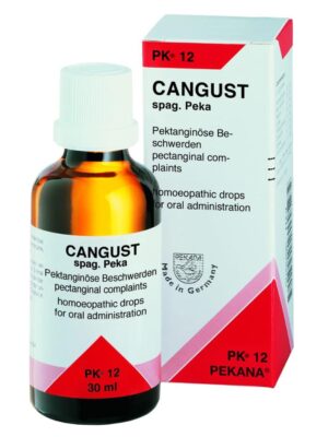 PK 12 CANGUST Concomitantly in aftercare after myocardial infarction Ingredients/Composition: Aesculus hippocastanum D2 Arnica Montana D4 Aurum chloratum D6 Carbo vegetabilis D8 Lachesis D6 Tabacum D6 Laurocerasus D3 Strophantus D4 Indications PK 12 CANGUST use for prophylaxis or treatment following a heart attack. Provides anti-inflammatory, anti-thrombotic properties that help prevent coronary insufficiency and sclerosis. Dosage and administration: If not differently prescribed adults take 15-20 drops, School children 7-10 drops 3 times a day away from meals. For pediatric doses. Consult your health care practitioner. One bottle containing 30 ml solution for oral administration, containing the active ingredients in the strengths listed under description. Warnings and Precautions: If symptoms persist, contact a licensed health care practitioner. If you have known sensitivity to any of the ingredients, please consult your licensed health care practitioner before use. If you are pregnant or breastfeeding, seek the advice of a health care professional before use. Keep out of reach of children. Pack size: 30 ml