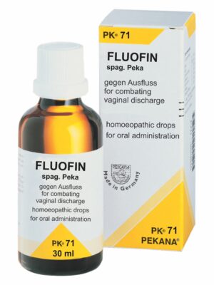 PK 71 FLUOFIN To normalize the mucous secretion in case of vaginal flour Ingredients/Composition: Acidum sulfuricum D4 Calcium Fluoratum D8 Helonias dioica D6 Hydrastis Canadensis D10 Kreosotum D6 Lamium album D4 Pulsatilla D4 Indications PK 71 FLUOFIN drops are well-proved drops for leucorrhoea (Vaginal discharge) and female related other problems. Dosage and administration: If not differently prescribed adults take 15-20 drops 3 times a day away from meals. For pediatric doses. Consult your health care practitioner. One bottle containing 30 ml solution for oral administration, containing the active ingredients in the strengths listed under description. Warnings and Precautions: If symptoms persist, contact a licensed health care practitioner. If you have known sensitivity to any of the ingredients, please consult your licensed health care practitioner before use. If you are pregnant or breastfeeding, seek the advice of a health care professional before use. Keep out of reach of children. Pack size: 30 ml
