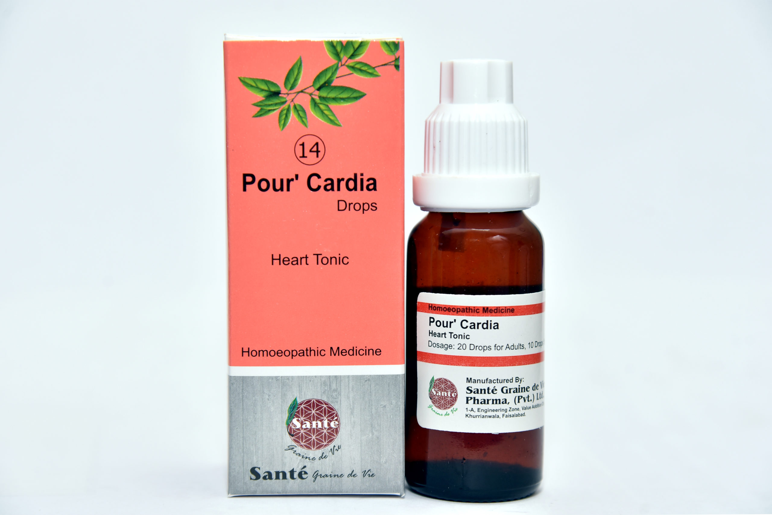 Description SD-14 POUR’CARDIA (DROP) 20 ml Heart tonic Ingredients/Composition: 100 ml contain: Amyl nit 3x Crataegus oxy Q Cactus grand Q Carbo veg 6x Arnica mont 3x Indications Chest pain ,chest tightness, chest pressure or discomfort, irregular heartbeats that feel rapid, pounding or fluttering Dosage and administration: If not differently prescribed adults take 20 drops three times a day. Children take 10 drops three times a day. For pediatric doses. Consult your health care practitioner. One bottle containing 20 ml liquid for oral administration, containing the active ingredients in the strengths listed under description. Warnings and Precautions: If symptoms persist, contact a licensed health care practitioner. If you have known sensitivity to any of the ingredients, please consult your licensed health care practitioner before use. If you are pregnant or breastfeeding, seek the advice of a health care professional before use. Keep out of reach of children.