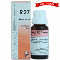 Dr. Reckeweg R 27 Renocalcin Renal Calculi Drops Indications: Renal calculi, sharp pains in the kidneys, pains across the small of the back, prickings, reddish and glairy urine with epithelial cells and amor- phous waste matter. Oxalic acid in the urine, gravel. Mode of Action of Main Ingredients Acid. nitric: Calculi in the urine due to oxalic acid, and when oxalic acid is the main ingredient of the calculi. Berberis: Sharp pains in the kidneys, growing worse on pressure. Pains in sacral region, coming from kidneys, patient cannot move, leans to right in order to lessen the pains. Glairy, reddish urine.Lycopodium: Painful urination, gravel. Renal colics (right side affected). Pains along the urethra to the bladder. Lapis renalis: Effective constitutional remedy. Lycopodium: Painful urination, gravel. Renal colics (right side affected). Pains along the urethra to the bladder. Rubia tinctor: Catarrh of the bladder caused by calculi. Frequent urge to urinate at night, with great weakness. Pains from kidneys to urethra. Sarsaparilla: Gravel, acute pains when urinating. Dosage: Generally 3 times daily 10-15 drops in some water. After one weak of treatment it will suffice to take 5-18 drops, 2-3 times daily for a longer period of time. Remarks: In colics due to renal calculi: R 37, 10 drops in some water 15-30 minutes.In albuminuria and nephrosis: see R 64.Cystitis and cysto-pyelitis and bacteriuria: see R 18, in addition oralternation with R 27.In prostate hypertrophy accompanied by cystitis: see R 25.