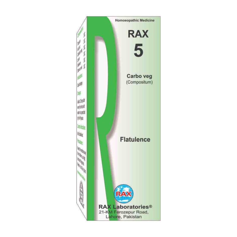 Indications: Flatulence due to gastric ulcer and ulceration of large intestine, acidity, burning heart, indigestion, Gastritis, sour eructation after eating, bad taste of mouth, nausea, vomiting and digestion slow. RAX No. 5 is very useful in flatulence and stomach problems.