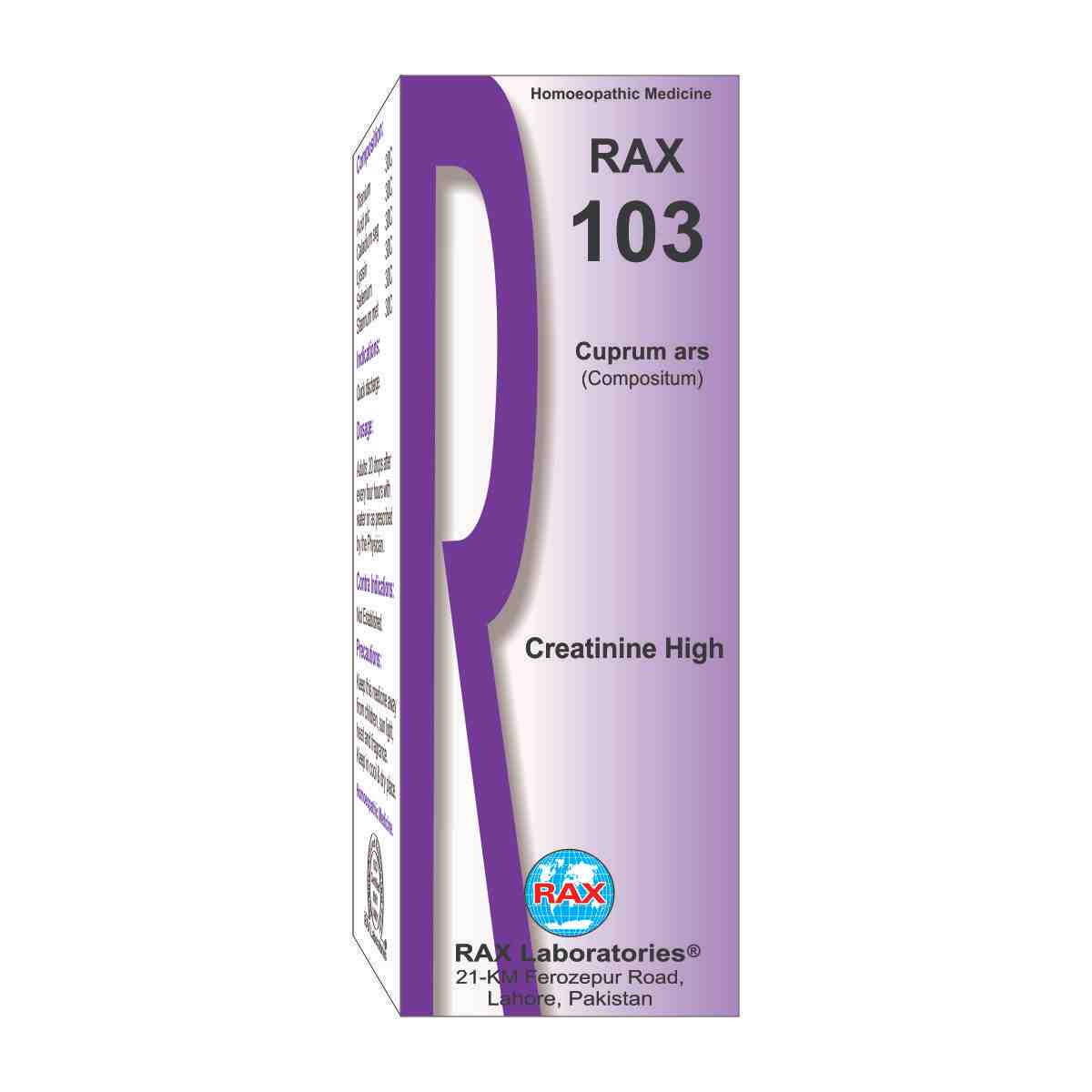 Indications: Creatinine level raised in body due to improper functioning of kidneys. So waste materials not expelled properly out from body and kidneys becomes weak. Rax no. 103 reduces creatinine level.