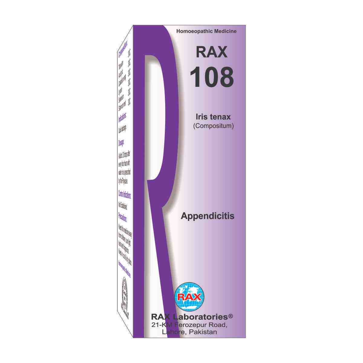 Indications: Inflammation in large intestine at right sacrum. It my be burst if not treated. Pain at right side in abdomen bellow umbilicus which comes in waves and remains constant. Nausea and vomiting, face red or pale due to appendicitis. Rax no. 108 works good on inflammation of appendices.