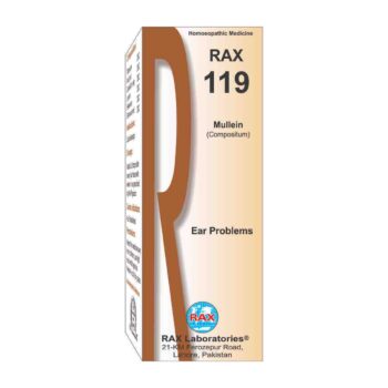 Indications: Dryness and pain due to abscess in ears, itch, puss or blood discharge from ears. Inflammation of middle ear, pain in inner ear due to injury or water goes in ear, cough, cold, throat inflammation, and horsness or deafness and other ear problems. Lack of hearing due to fever, voices in ear and deafness. Rax no. 119 can be successfully used in all types of ear problems.