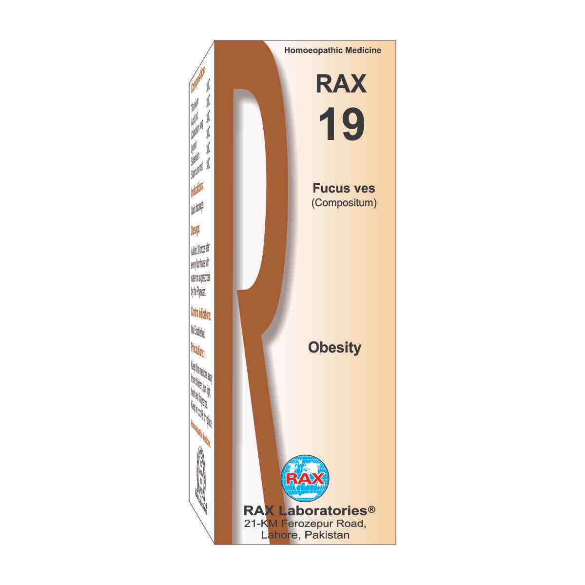 Indications: Obesity means over weight due to thyroidism or digestive problems. Obesity due to excessive use of meat, fatty foods, sugar and sweets, glandular and hormonal problems. Weight gaining in spite of low diet. Rax No. 19 is an effective medicine to reduce weight and obesity.