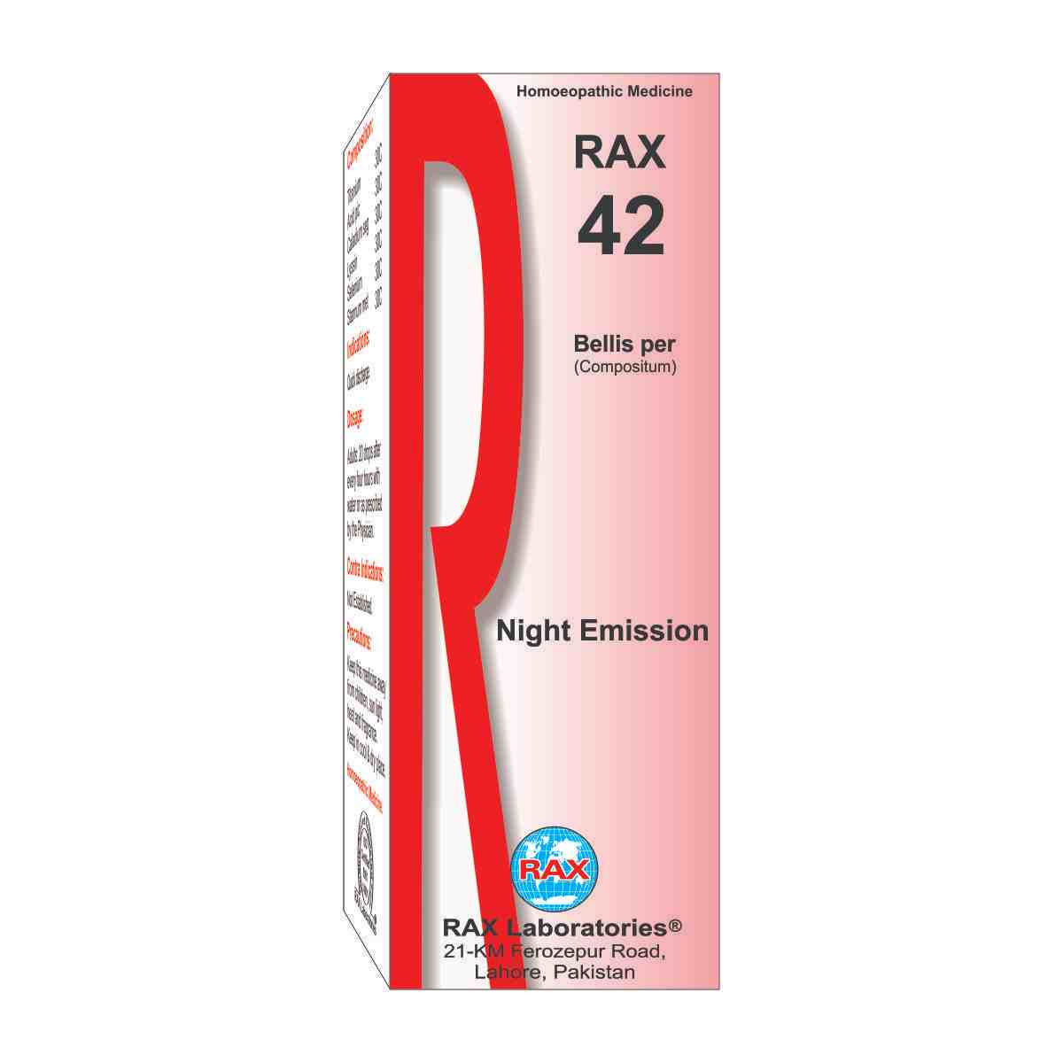 Indications: Night emission means ejaculation during sleep. Mental, physical and sexual weakness due to night falls and sensitiveness. Heart beat fast, respiration fast, backache, ever t ired, sadness, i rri tabil ity, indigestion and gas formation. Rax no. 42 has a good repute in night emissions.