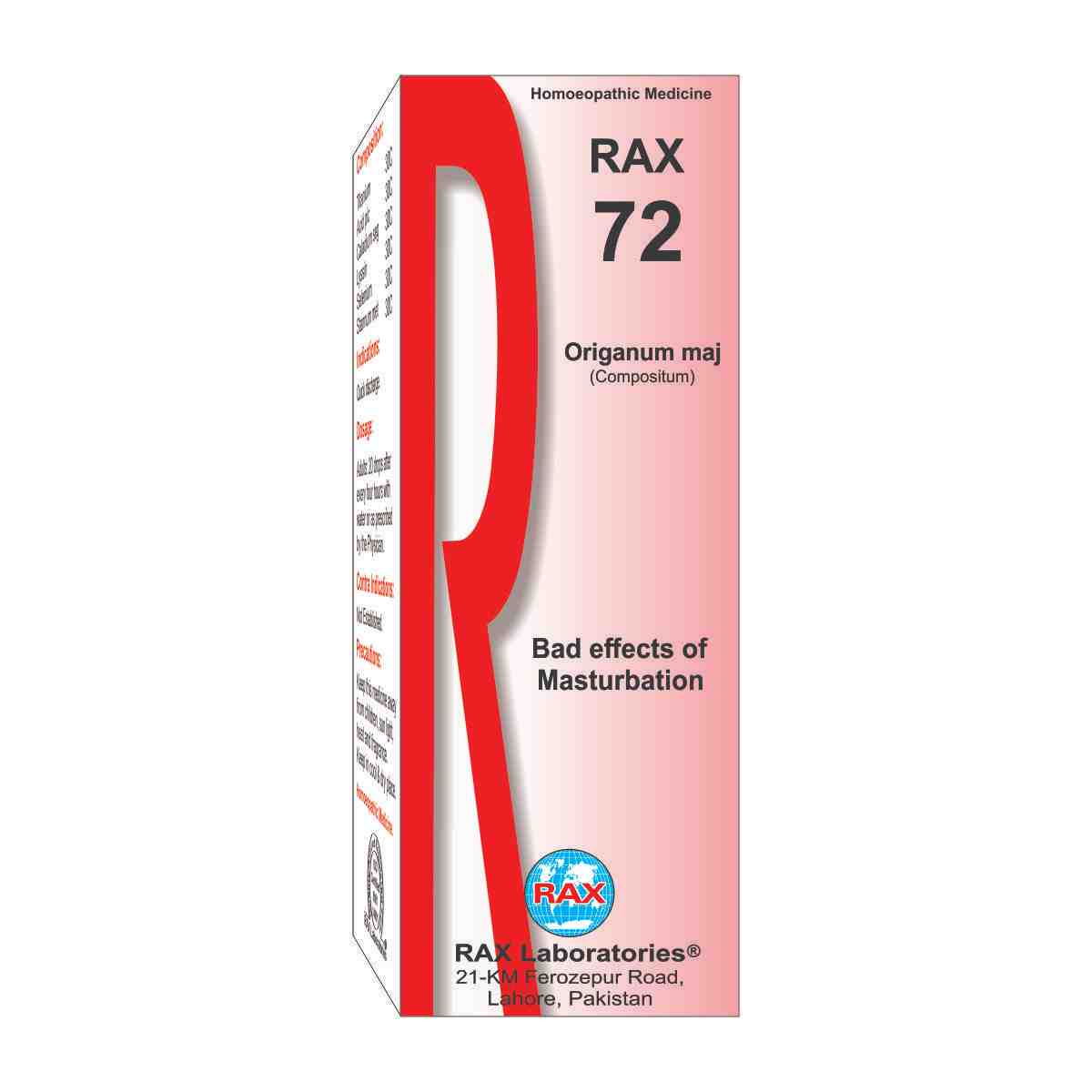 Indications: Bad effects of masturbation, sexual problems weakness of penis, curved penis, impotency, premature ejaculation, night falls, spermatorrhoea. Mental, physical nervous and sexual weakness. Pain in back, legs and whole body. Rax no. 72 cures the bad effects of masturbation.