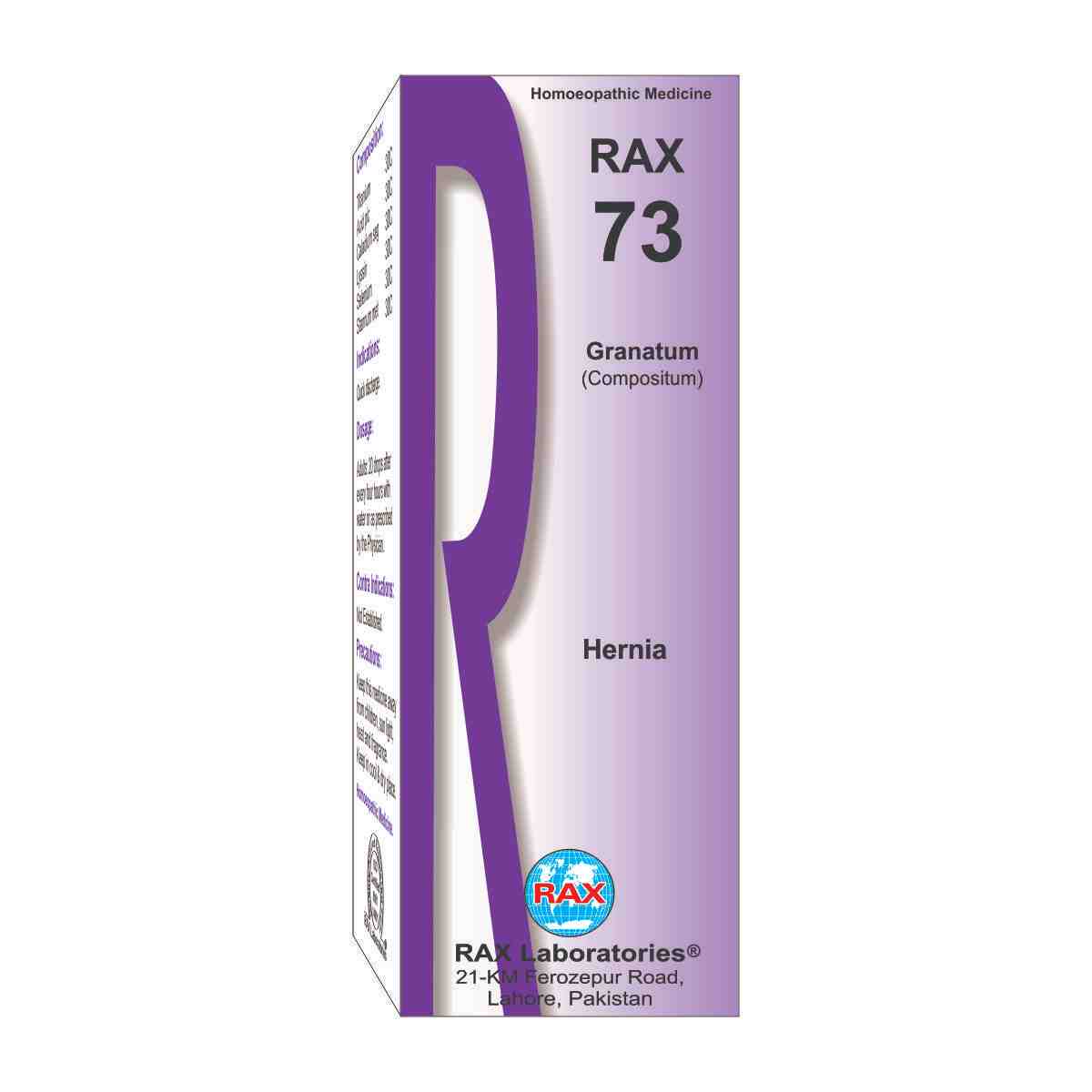 Indications: Hernia of Inguinal, thighs, umbilical, testicular, and ailments related to hernia. Restlessness and pain in inguinal region due to over lifting. Testicles hanged and painful, hernia also can be occour in children. Continuous use of Rax no. 73 repeals hernia of all types.