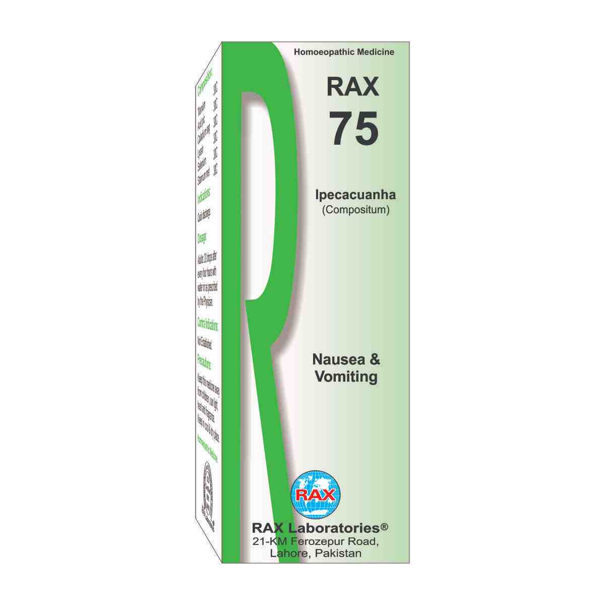 Indications: Nausea and vomiting due digestive disorders, food poisoning, constipation, flatulence, indigestion, headache and kidney pain. Nausea and vomiting during pregnancy, cholera and travelling. Rax no. 75 is useful all types of nausea and vomiting.