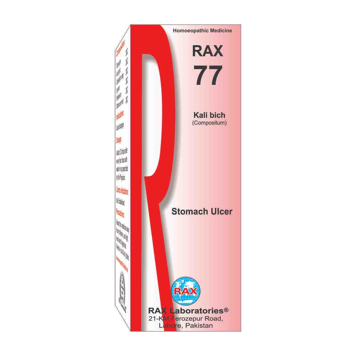 Indicat ions: Stomach ul cer, aci di ty, burni ng heart , indigestion, gas, abdominal pain and cramps. Diarrhea or constipation. Lack of appetite, abdomen and bowels bloated after eating. Sour eructation, nausea and vomiting, coated tongue and bitter taste of mouth. Rax no. 77 is a good remedy for stomach problems.