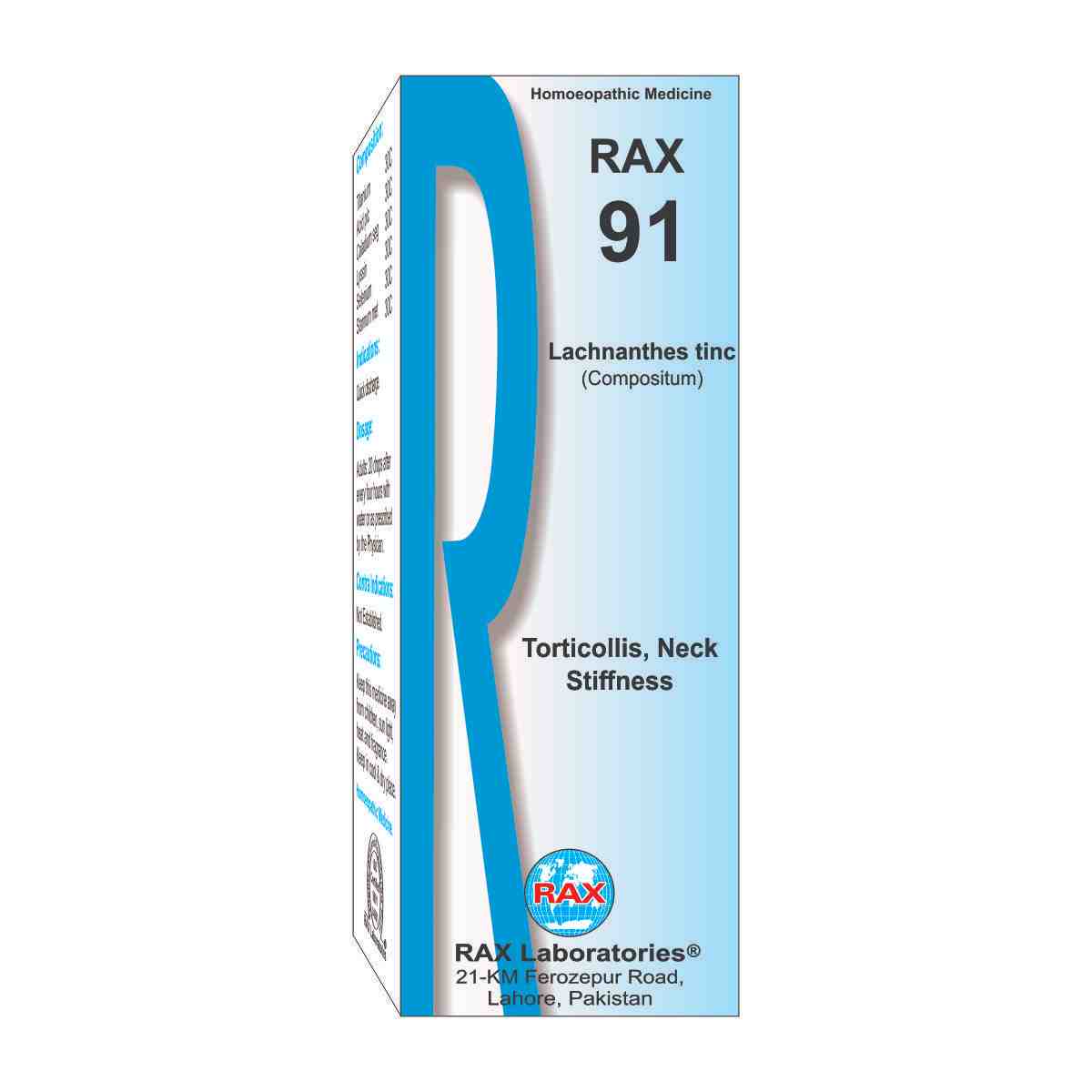Indications: Neck stiffness, pain in nerves and vertebras by movement of neck, stress and strain, stiffness of neck in one side. Mental grief, angerness excessive physical work, high blood pressure and neck stiffed after awakening. Stress in shoulder with numbness of arm and hands. Rax no. 91 cures torticollis.