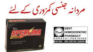 Composition: Acidum phosphoricum D3, Agnus Castus D4, Cobaltum nitricum D3, Damiana Ø, Ginseng D2, Orchitinum D3, Scutellaria D2, Selenium D3. Indications: Spervina is effective in improving the morphology and mobility of the sperms. It is compound of indigenous homoeopathic medicines reputed to have a pharmacological action in oligospermia. It tones up the system. Improves general vitality and acts as a restorative and nerve tonic. Spervina also effect complete and powerful contraction of the seminal vesicles. consequently bringing about their complete evacuation and increases the quantity of semen ejaculated. Indicated in low sperm count azoospermia oligospermia. Defective sperm due to impotence, premature ejaculation. Dosage: 2 Capsules three times a day or as prescribed by Homoeopathic Doctor. Presentation: Available in 30’s Capsules packing. Precautions: Store in a cool and dry place. Keep away from the reach of children.